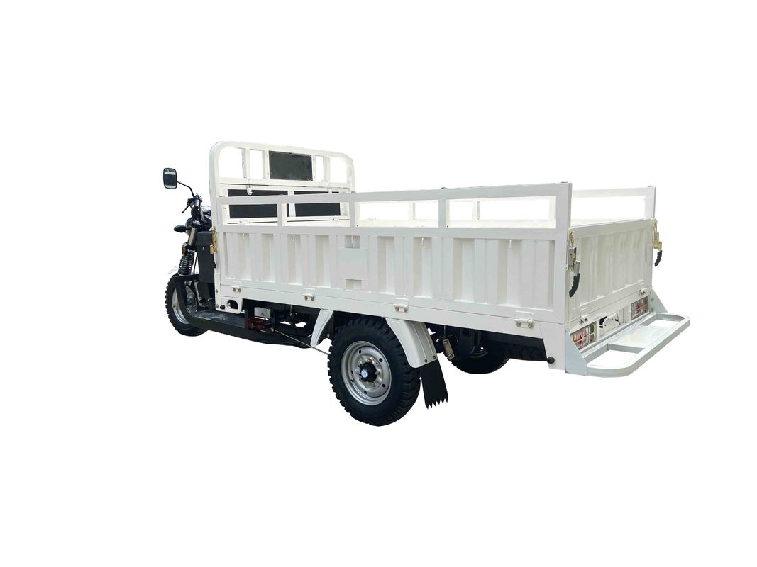 3 wheel Cargo Motor Tricycle for heaving loading under rough roads. Three same wheels with new style fuel tank and #60 front shock absorber,5.50-13 tires, heavy loading rear axle with booster, big footrest. with spare tire and 2T jack. cargo box size:2.4m*1.4m